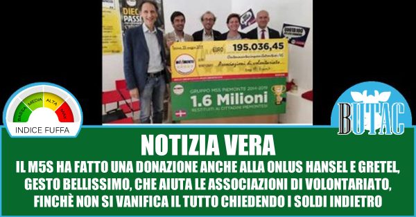 Su venti segnalazioni ricevute almeno la metà riguarda Bibbiano. Quindi vediamo di trattare l’ennesima verifica che ci avete richiesto in merito. Circola una foto che mostra la consegna di un importante assegno da parte del Movimento 5 Stelle a un’associazione di volontariato: