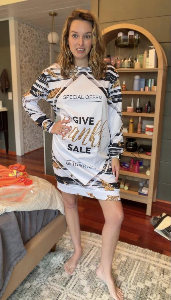 Qualche dettaglio nella foto avrebbe dovuto allarmare Maggie, visto che l’immagine non mostrava un vestito con zucche e tacchini, e che quello che pareva un logo sovraimpresso per pubblicizzare lo sconto in realtà non era quello che sembrava…