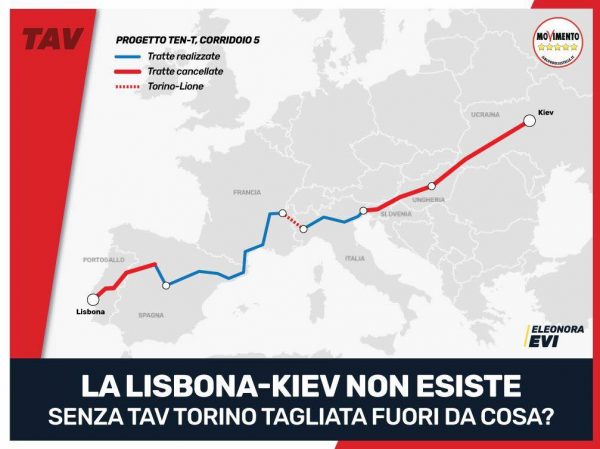L’immagine in questione ci mostra la mappa del tracciato della TAV per quanto concerne il corridoio 5, quello che vede coinvolta la Torino-Lione e i lavori in Val Susa. È abbastanza palese che Eleonora Evi sia contraria alla TAV, e ce lo spiega con un post che accompagna l’immagine.