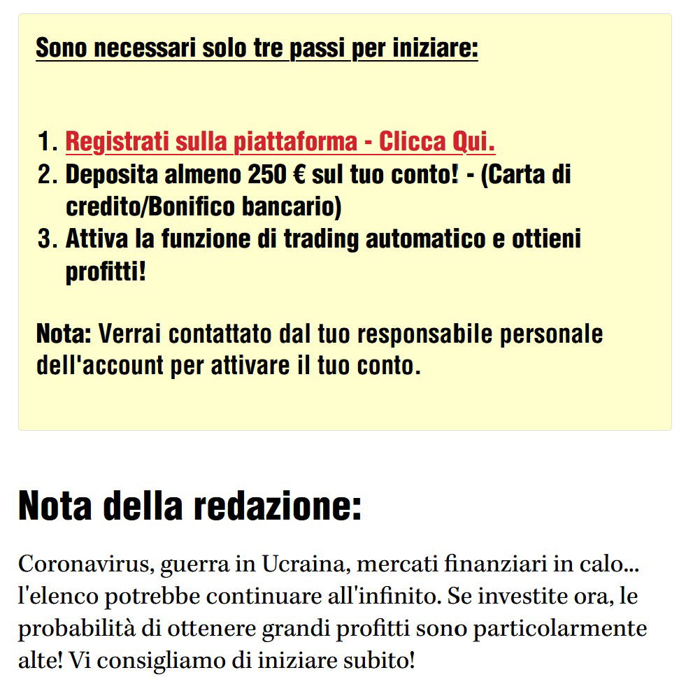 Non potete permettervi di perdere questa opportunità. Continuerà a rendere estremamente ricchi i suoi utenti, indipendentemente dal fatto che il Bitcoin salga o scenda. In sole poche settimane, quasi ogni investimento iniziale sarà moltiplicato per almeno cinque volte. La registrazione e la gestione del conto sono gratuite – non ci sono costi nascosti. E c’è poco o nulla da perdere, poiché potete prelevare il vostro saldo in qualsiasi momento.