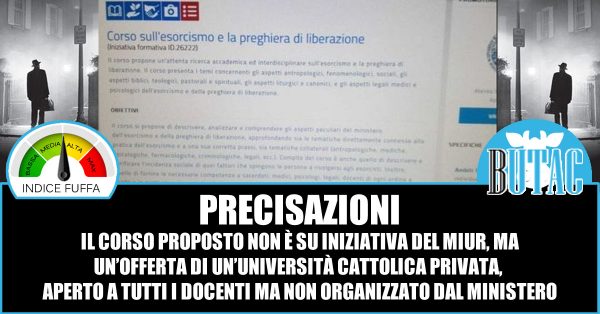 Quindi sì, è vero che tra le proposte formative per docenti esiste anche il “Corso sul’esorcismo e la preghiera di liberazione”, ma non è qualcosa che organizza il nostro Ministero dell’Istruzione bensì qualcosa di proposto da un’università cattolica. Università che spero non riceva fondi pubblici per questo genere di corsi ma che, nel caso, ha tutto il diritto di proporre quel che gli pare.