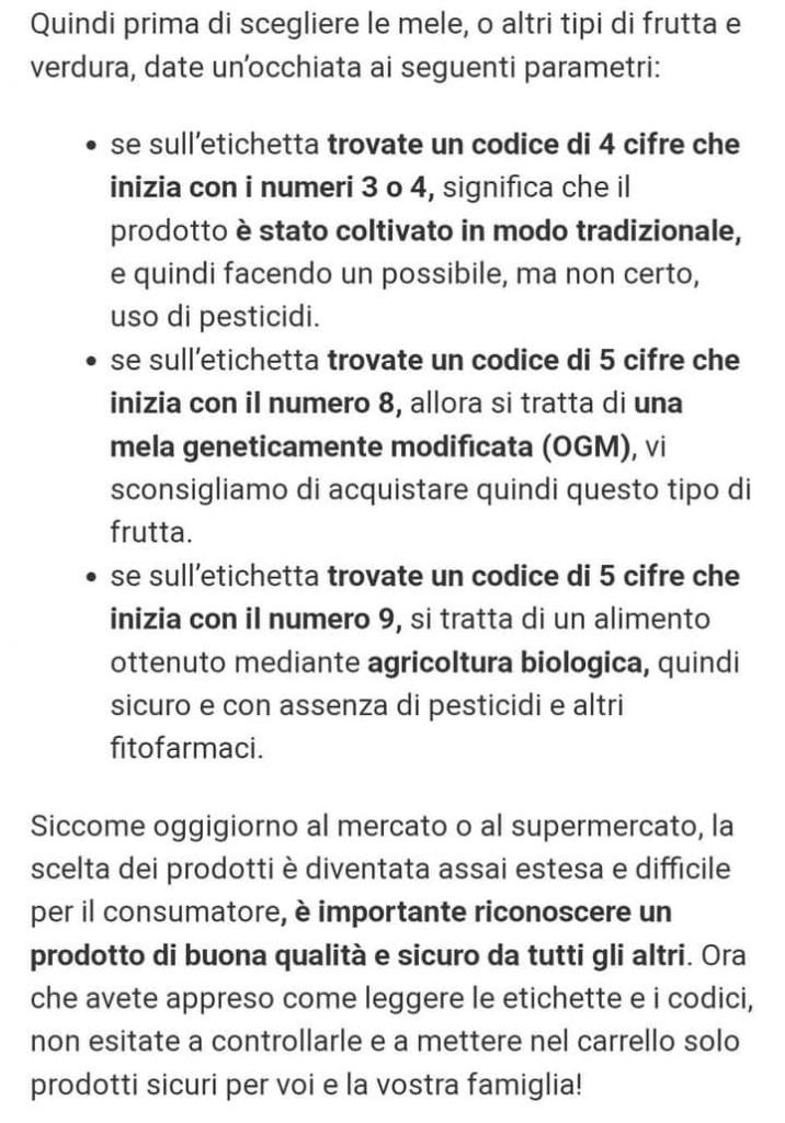 Da nessuna parte sul sito di IFPS si parla di codici riservati a OGM o a prodotti con più pesticidi di altri. L’unica differenza evidente che viene fatta è tra coltivazioni bio o non bio. Differenza che non significa affatto che siano prodotti più sani, ma solo che sono stati coltivati seguendo i dettami dell’agricoltura biologica. Ma state attenti, perché qui è dove sta il problema. Scriveva la dottoressa Bianco: