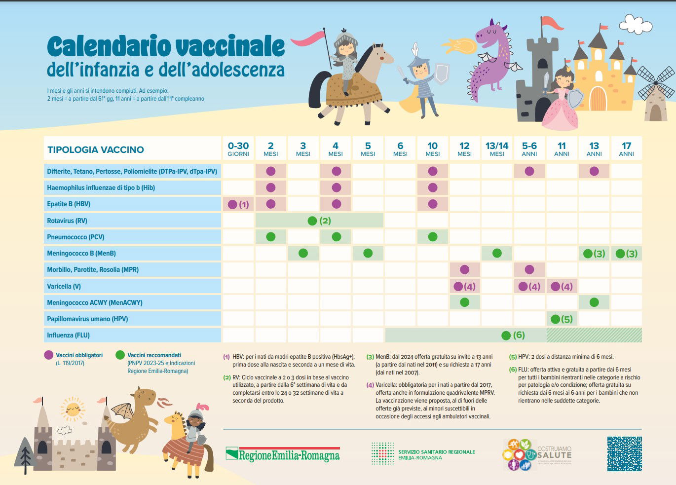 Il video si apre con l’immagine fissa del calendario vaccinale dell’infanzia e dell’adolescenza distribuito online dalla Regione Emilia Romagna, questo per capirci: