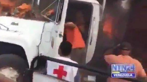 La versione di Telesur sostiene che i camion avrebbero preso fuoco per mano degli stessi anti-Maduro, che li avrebbero incendiati appositamente.