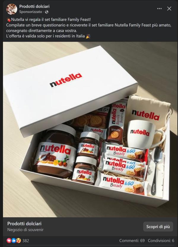 Fossi in Ferrero denuncerei la truffa, e denuncerei Meta che ne permette la diffusione grazie agli annunci sponsorizzati.
