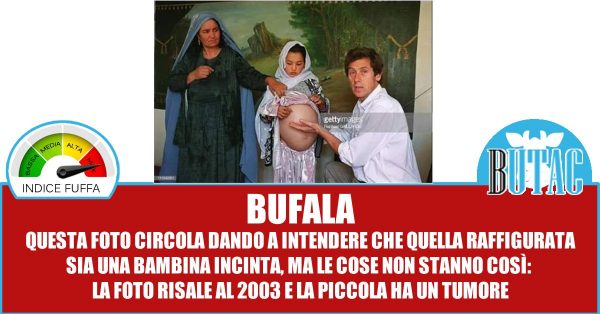 Si vedono una signora, una bambina col ventre molto gonfio e un signore che indica il ventre della bimba. Quest’immagine allegata alle parole di cui sopra fa pensare a chiunque che si tratti di una bimba incinta, magari una sposa bambina, magari una vittima di violenza sessuale. Basta guardare i commenti sotto al post per accorgersi che tutti hanno preso così la foto. La mia amica ha subito segnalato che la foto è decontestualizzata e non mostra affatto quanto riportato nel post.