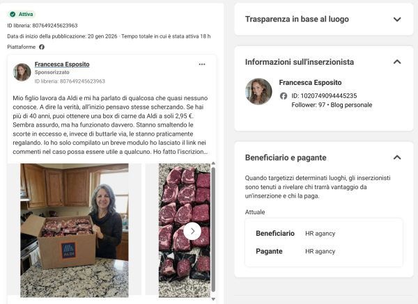 La pagina che lancia il post sponsorizzato – un falso profilo personale per rendere il post più credibile – è stata aperta il 19 gennaio 2026, e in meno di 48 ore ha lanciato 18 post sponsorizzati. Diciotto. Diciotto occasioni in cui Meta ha incassato denaro senza battere ciglio a fronte di diciotto esche create apposta per truffare il pubblico di Facebook.