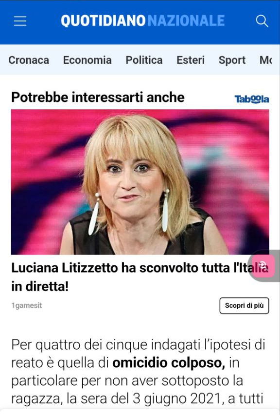 Guarda caso proprio sotto l’articolo dove si parlava della truffa realizzata usando i nomi di Fazio e del figlio del mitico Enzo ecco che su Quotidiano Nazionale, in uno degli spazi gestiti da Taboola, appariva Luciana Littizzetto, con un post sponsorizzato che rimandava a un falso articolo con falsa intervista realizzata grazie all’intelligenza artificiale.