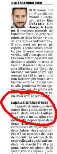 Nell’articolo sul quotidiano di Belpietro tutto questo non viene spiegato, l’analisi viene presa per affidabile, e nel primo paragrafo smette di essere un’analisi fatta dal Dipartimento della salute della Florida e diventa magicamente “l’analisi statunitense”. Ma vedete, gli Stati Uniti hanno 50 Stati, la Florida è l’unico dove per ora si siano mossi in questa direzione, chiamarla “analisi statunitense” ingigantisce la portata dell’analisi in modo che il lettore venga portato a credere che sia più grande – e importante – di quel che effettivamente è.