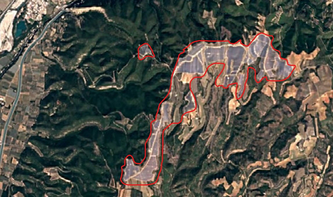 Così è come appare la zona dall’immagine satellitare del 2022, in rosso le aree coperte dal fotovoltaico