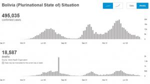 Questo è il grafico dell’andamento di contagi e morti in Bolivia secondo l’OMS: