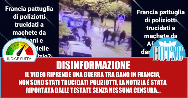 Ma il post che sta circolando viralmente in realtà era collegato ad altro, fino a qualche giorno fa veniva condiviso con un video, già trattato dall’amico (e collega, visto che da mercoledì 23 ottobre cominciamo insieme una nuova avventura televisiva – per chi non lo sapesse saremo su NOVE alle 23:30 ad affiancare Valentina Petrini in FAKE – La fabbrica delle notizie) David Puente il 9 ottobre. Il video che era allegato mostrava gruppi di persone (anche con quelli che sembrano machete) combattere in mezzo a una strada. David aveva trovato la fonte del video, che non mostrava una pattuglia di poliziotti attaccata, ma una guerra tra gang rivali in un paesino francese. La notizia, di nessun interesse per il pubblico italiano, era comunque stata riportata sulle testate francesi.