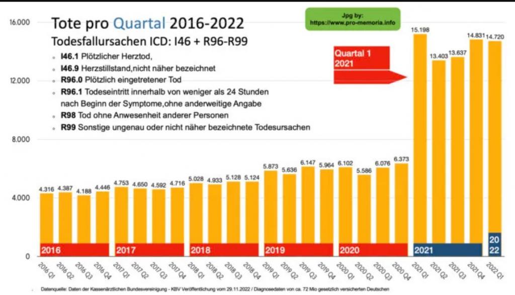 …i dati di 72 milioni di assicurati mostrano “le morti impropronte e inaspettate sono esplose” in Germania dal 2021! Lo dimostrano i dati appena rilasciati dei 72 milioni assicurati dall’Association of Statutory Health Insurance Physicians (KBV). Il numero è più che raddoppiato da quando il vaccino è stato introdotto alla fine del 2020, passando da circa 6000 per trimestre a 14.000 attualmente.