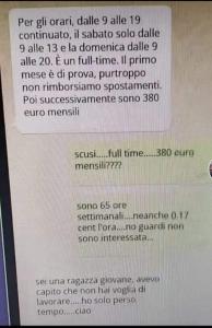 Riteniamo, per l’ennesima volta, utile evidenziare che la condivisione di contenuti non verificati è un danno, anche quando riguarda qualcosa che potrebbe essere vero. Chi per primo ha condiviso quel contenuto dovrebbe spiegarne la provenienza specificando anche il nome del datore di lavoro che ha fatto l’offerta, perché se il dialogo fosse reale il datore di lavoro starebbe proponendo una violazione gravissima dei diritti dei lavoratori e andrebbe denunciato all’Ispettorato del lavoro, e non anonimizzato sui social.