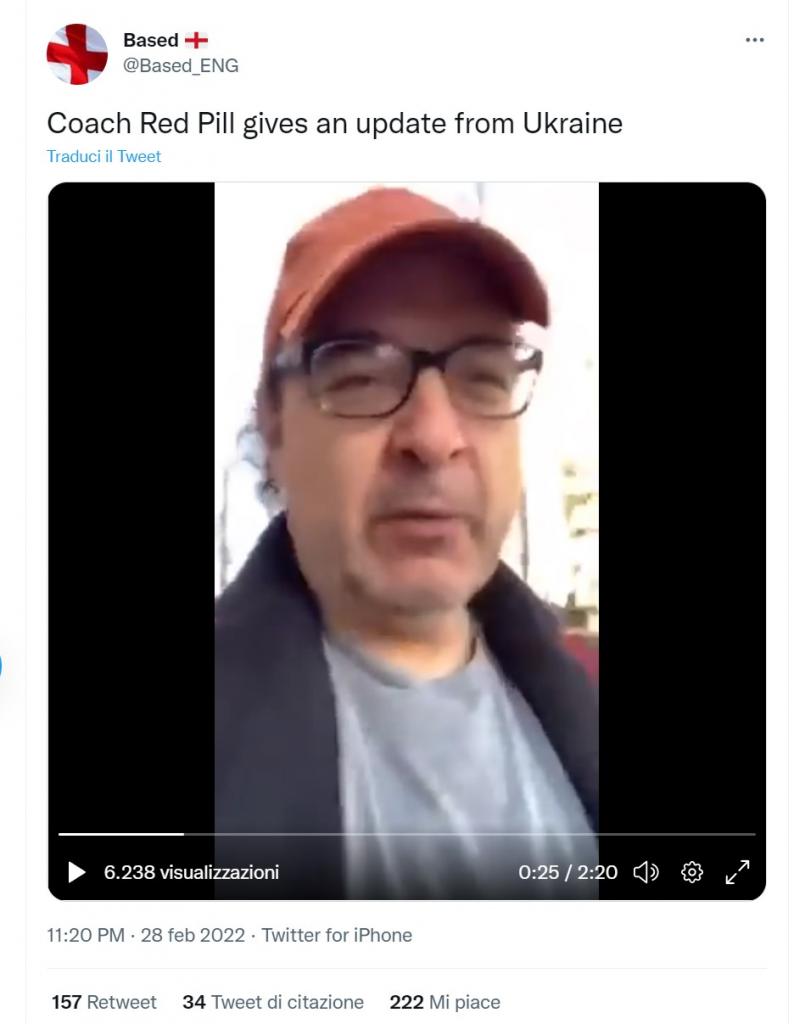 In tanti ci avete segnalato dei video dove un signore sulla cinquantina, in perfetto inglese americano, attacca i giornalisti stranieri in Ucraina definendoli “pigs journalist, system journalist” e mandandoli più volte a quel paese. Sono video che sicuramente hanno un certo impatto su chi si fa domande su cosa stia succedendo, sono video comodi, perché il signore – che si chiama Gonzalo Lira ma ha canali social dove si fa chiamare Coach Red Pill – dà a intendere che la guerra sia più un’invenzione mediatica che altro.
