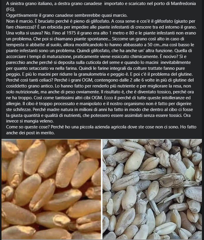 A sinistra grano italiano, a destra grano canadese importato e scaricato nel porto di Manfredonia (FG).>Oggettivamente il grano canadese sembrerebbe quasi marcio.Non è marcio. È bruciato perché è pieno di glifosfato . A cosa serve e cos’è il glifosfato (giusto per fare chiarezza)? È un erbicida per impedire alle piante infestanti di crescere tra ed intorno il grano. Una volta si usava? No. Fino al 1975 il grano era alto 1 metro e 80 e le piante infestanti non erano un problema. Che poi si chiamano piante spontanee… Siccome un grano così alto in caso di tempesta si abbatte al suolo, allora modificandolo lo hanno abbassato a 50 cm…ma così basso le piante infestanti sono un problema. Quindi glifosfato, che ha anche un’ altra funzione. Quella di accorciare i tempi di maturazione, praticamente viene essiccato chimicamente. È nocivo? Sì e parecchio anche perché si deposita sulla cuticola del seme e quando lo macini inevitabilmente per quanto setacciato va nella farina. Quindi le farine integrali da colture trattate fanno pure peggio. E più lo macini per ridurre la granulometria e peggio è. E poi c’è il problema del glutine. Perché così tanti celiaci? Perché i grani OGM, contengono dalle 2 alle 6 volte in più di glutine del cosiddetto grano antico. Lo hanno fatto per renderlo più nutriente e per migliorare la resa, non solo nutrizionale, ma anche di peso ovviamente. Il risultato è, che è diventato tossico, perché ora ne ha troppo. Così come tantissimi altri cibi OGM. Ecco il perché di tutte queste intolleranze ed allergie. Il cibo è troppo processato e manipolato e il nostro organismo non è fatto per digerire ste schifezze. Perché madre natura in milioni di anni ha fatto in modo che dentro al cibo ci fosse la giusta quantità e qualità di nutrienti, che potessero essere assimilati senza essere tossici. Ora invece si mangia veleno.