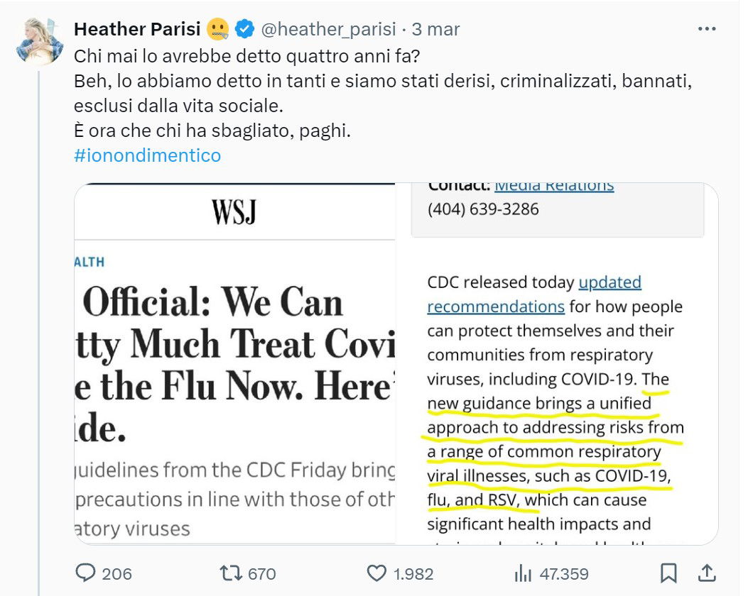 Il commento dell’ex ballerina e soubrette italiana, alla luce di quella parolina magica, è assolutamente insensato. Quattro anni fa COVID-19 non era quello che è oggi: variazioni, mutazioni, vaccini hanno portato la malattia che negli anni ha causato centinaia di migliaia di morti nel mondo a essere qualcosa di simile a una comune influenza, esattamente come cent’anni fa era successo con la spagnola. Heather, che nasce americana e sa benissimo che quel “now” ha un significato ben preciso, se ne infischia: lei deve portare avanti la propria narrazione, che vede i medici di tutto il mondo come criminali da portare a Norimberga, e quelli come lei come eroi che sapevano la verità già da anni.
