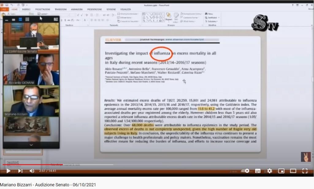 Qui sopra potete vedere lo screenshot dell’intervento dell’oncologo Mariano Bizzarri che cita quel dato, e vedete cosa mette in evidenza del testo dello studio. Peccato che non venga chiarito da subito che quel numero è la somma della mortalità eccessiva dei quattro anni presi in considerazione: