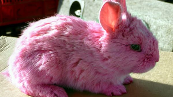La storia di questo coniglio non è proprio allegra, la foto viene da un mercato di El Salvador dove i conigli piccoli, per esigenze commerciali (ovvero attrarre l’attenzione dei possibili clienti) vengono spruzzati di colorante e venduti così. La loro vita media è decisamente breve.