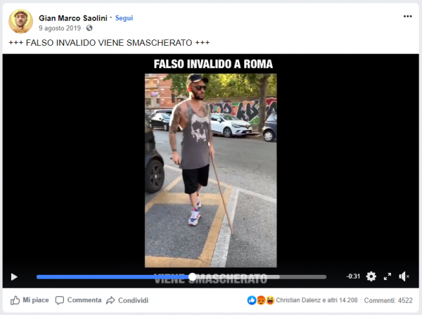 Nel video si vede Saolini parcheggiare la sua Smart nel posto invalidi e scendere dalla stessa con un bastone da cieco. Saolini si spaccia per uno che per l’appunto fa satira, e il video sulla sua pagina FB ha oltre 14mila like, oltre 24mila condivisioni. Quanti amici dei 24mila condivisori sono in grado di capire che si tratta di una bufala? Non possiamo saperlo di preciso, ma conoscendo il popolo della rete purtroppo stimo che ci sia una buona fetta di persone che non lo capisce. Come non l’hanno capito alcuni malati di sclerosi multipla, che in una delle tante pagine social che trattano la malattia hanno condiviso il post in questi giorni, ovviamente indignandosi. Ecco, io vorrei che il buon Saolini decidesse di devolvere parte degli incassi che fa grazie alla sua “satira” a chi la sua “satira” non la comprende. A chi vede il suo video come un sopruso e perde tempo a indignarsi inutilmente contro qualcuno che è solo un abile ciarlatano (dalla Treccani: s.m. Chi si spaccia per quello che non è, chi cerca il proprio guadagno dandola a intendere, impostore, gabbamondo).