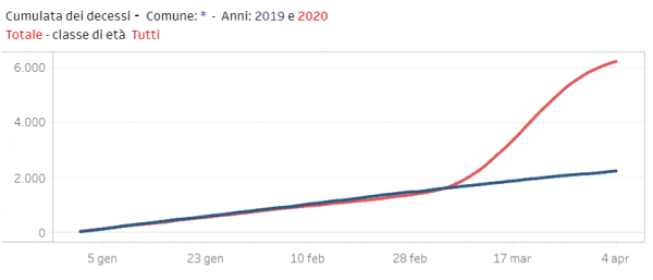 Riscrivo qui per migliorarne la lettura: dai dati ottenuti su 1689 comuni con lo scostamento più alto risultano 18638 decessi in più rispetto alla media dei 5 anni precedenti, 17440 escludendo i decessi del 2016. Guardando questi dati da altra angolazione questo significa un aumento del 30% di decessi rispetto alla media dei cinque anni precedenti nei primi tre mesi dell’anno. Ora se vogliamo continuare a nascondere la testa sotto la sabbia possiamo continuare a farlo, ma sostenere che non siano aumentati i decessi è negare l’evidenza, anche perché l’aumento è quasi esclusivamente avvenuto nell’arco del mese di marzo, rafforzando l’ipotesi che siano quasi tutti legati al nuovo virus. Questo aumento concentrato nel mese di marzo rende più chiara anche la difficoltà di molti ospedali nel gestire le salme.
