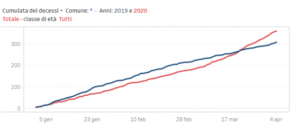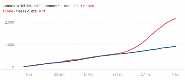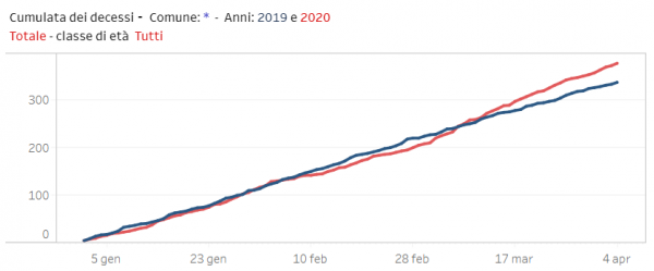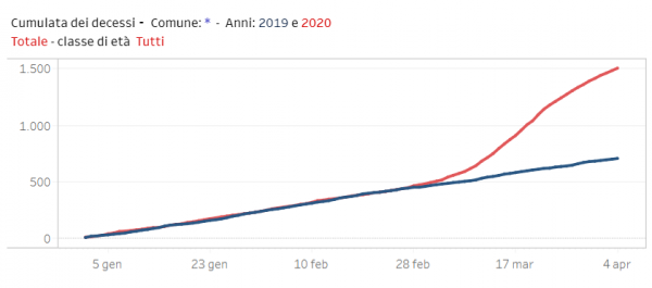 Le volte scorse avevamo preso in considerazione alcuni comuni, ma da oggi sul sito ISTAT gli scostamenti comune per comune si possono consultare con dei comodi grafici che permettono una lettura facilitata dell’andamento confrontando i dati del 2019 e 2020: l’impennata avvenuta durante il mese di marzo diventa evidente. Ricordo che per ogni provincia non ci sono tutti i comuni, siamo ancora sotto i 1700. Ecco alcuni esempi interessanti: