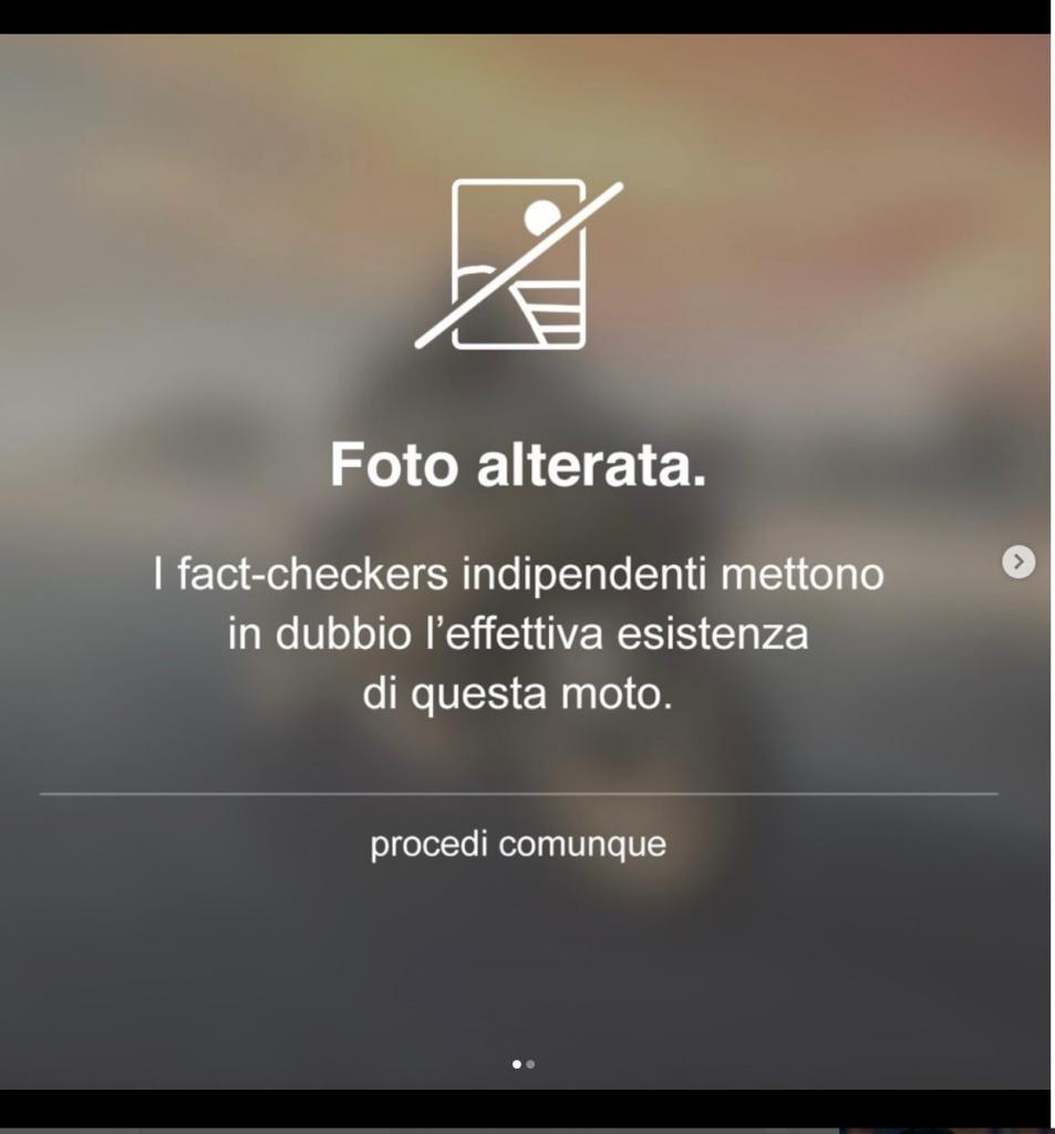 Avete mai incontrato messaggi d’avviso sulle fake news che specificano il problema in maniera così diretta? No, perché al massimo viene detto che il post in questione è stato verificato e trovato falso, impreciso o fuori contesto, e viene dato un link per approfondire e uno per vedere il post incriminato. Basta. Difatti il post qui sopra è una trovata pubblicitaria, che risulta evidente leggendo il testo che l’accompagna. I produttori di quella moto (o meglio il loro social media manager) hanno infatti accompagnato l’immagine con queste parole:
