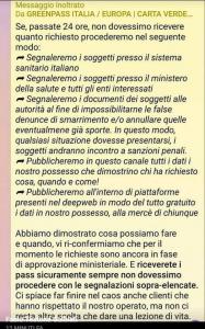 ➦ Pubblicheremo all’interno di piattaforme presenti nel deepweb in modo del tutto gratuito i dati in nostro possesso, alla mercè di chiunqueAbbiamo dimostrato cosa possiamo fare e quando, vi ri-confermiamo che per il momento le richieste sono ancora in fase di approvazione ministeriale. E riceverete i pass sicuramente sempre non dovessimo procedere con le segnalazioni sopra-elencate. Ci spiace far finire nel caos anche clienti che hanno rispettato il nostro operato, ma non ci resta altra scelta che dare una lezione di vita.