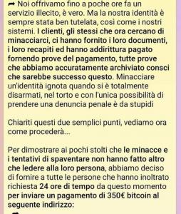 Se non sapete come acquistare bitcoin, è sufficiente fare una rapida ricerca su google, altrimenti non sappiamo come aiutarvi!Una volta inviato il pagamento sarà necessario unicamente inviare prove dal pagamento in questa chat (clicca qui per aprire la chat), alla ricezione del pagamento elimineremo tutti i dati i nostro possesso. Mantenendo la nostra parola come sempre stato.