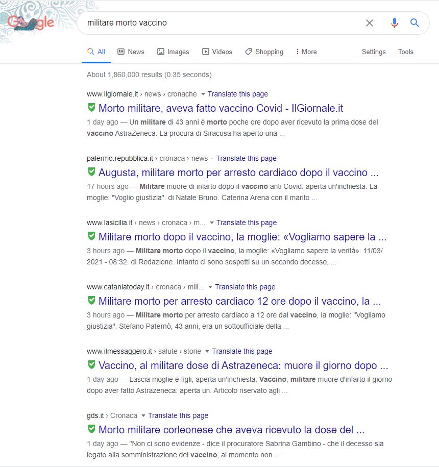 Ne hanno parlato tutte le principali testate, non so che radio ascolti la dottoressa Balanzoni, ma – senza nemmeno avere il nome del militare di cui parla, inserendo solo “militare morto vaccino” nel motore di ricerca, senza nemmeno restringere il campo della data – subito si nota che non è una notizia che è stata esattamente tenuta segreta. Ovvio che finché non si sono fatti approfondimenti (autopsie ed esami) dare troppo spazio alla questione senza avere nuove informazioni serve solo a spaventare chi si deve vaccinare, e quindi è abbastanza normale che uno o due giorni dopo i fatti non se ne parli come al momento di annunciarli, e si scelga di attendere eventuali sviluppi. Sviluppi che abbiamo visto esserci stati nei casi precedenti, dove autopsie ed esami successivi al decesso hanno scartato la possibilità di correlazione tra morte e somministrazione del vaccino.