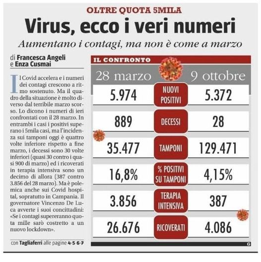 Tra NEGAZIONISTI e TERRORIZZATI esistono gli EQUILIBRATIEsistono delle persone che si mettono la mascherina per rispetto delle regole ma che non diranno mai “ormai è un’abitudine”. Esistono delle persone che ascoltano i telegiornali, ma che non prendono tutto per oro colato. Esistono delle persone che si pongono costantemente delle domande e non urlano arroganti convinzioni di gregge. Esistono delle persone che non si sono dimenticate di tutte le malattie extra covid e, che per colpa di una gestione scellerata, lottano per far sopravvivere i propri cari. Esistono delle persone che sono realmente consapevoli sia del valore della vita sia di quello della morte e che non hanno affidato alla scienza l’illusione dell’immortalità. Esistono delle persone per le quali “morire con Covid” o “morire per Covid” fa la differenza. Esistono delle persone che sanno ragionare con la propria mente e riconoscono nei numeri l’inviolabile verità.Esistono delle persone che comprendono che se il numero di tamponi il 23 marzo era 17.000 e il 9 ottobre è 128. 000 ed il numero di nuovi positivi è lo stesso (anzi a ottobre è di 331 in meno) le percentuali di positivi sui tamponi sono molto diverse 28% a marzo e 3,5% a ottobre e di conseguenza molto diversa è l’emergenza. Esistono delle persone che non si ancorano a proclami menzogneri e valutano i fatti nella loro più sacrale obiettività Esistono delle persone che RISPETTANO il pensiero di ognuno e non criticano, con supponente arroganza, chi abbraccia il dubbio e non il dogma. Esistono delle persone che sanno che non è la mascherina a limitare la libertà bensì, lo è, il clima di immorale terrore e devastante decontestualizzazione.Tra NEGAZIONISTI e TERRORIZZATI..ESISTONO gli EQUILIBRATI!E aggiungo IO SONO UNA DI QUESTE !!!