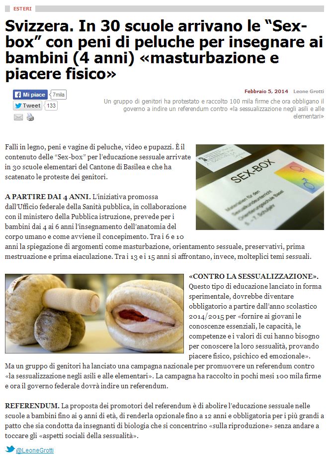 E non han detto una bufala, i “sex box” esistono, ma sono operativi dal 2011, e lo stesso vale per la petizione di cui si parla, petizione che ha raccolto le firme necessarie già ad Ottobre, e da quello che si capisce nei prossimi mesi si voterà se lasciare le cose come sono oggi o se eliminare l’educazione sessuale dalle scuole almeno fino ai 12 anni (e dopo limitarsi a quella fatta in biologia, bella cosa il progresso).Oltretutto da quel che abbiamo capito qui a Bufale non si tratta di un iniziativa che è avvenuta in tutta la Svizzera, ma solo in un unico preciso cantone, anzi in 30 scuole di quel cantone…insomma non mi pare sia necessario un articolo così eclatante…