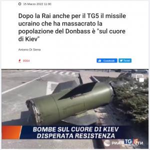 Sì perché vedete, il servizio è disponibile a tutti, e non sostiene affatto che quel missile sia caduto su Kyiv, spiega chiaramente che si tratta di un missile caduto nel Donetsk, solo nella copertina a inizio TG l’immagine appare col titolo in sovraimpressione che – se preso un singolo fotogramma e non l’interezza del carosello dei titoli del TG5 – fa credere quello che non è. Ma il servizio era corretto e chiunque può rendersene conto andando a vederlo qui.