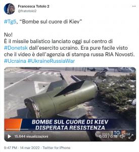 Sì perché vedete, il servizio è disponibile a tutti, e non sostiene affatto che quel missile sia caduto su Kyiv, spiega chiaramente che si tratta di un missile caduto nel Donetsk, solo nella copertina a inizio TG l’immagine appare col titolo in sovraimpressione che – se preso un singolo fotogramma e non l’interezza del carosello dei titoli del TG5 – fa credere quello che non è. Ma il servizio era corretto e chiunque può rendersene conto andando a vederlo qui.
