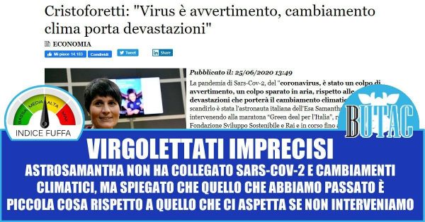 La frase non è stata detta in questo modo da Astrosamantha, sembra una questione di lana caprina ma non è così. La frase riportata da Adnkronos è troppo riduttiva, sembra quasi che Cristoforetti stia collegando la pandemia al cambiamento climatico. Ma non è così. Astrosamantha ha fatto un lunghissimo discorso sulla Terra e sul cambiamento climatico. Cliccando qui potete trovare il punto preciso in cui riporta questa frase che vi ho trascritto: