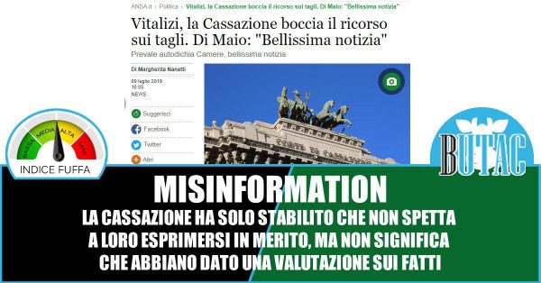 La Cassazione non si è espressa in alcuna maniera sul taglio dei vitalizi. La Cassazione si è limitata a stabilire delle competenze, ritenendo che il ricorso presentato sia inammissibile in quanto non può essere la Cassazione a pronunciarsi. Titolare come se si fossero espressi pro o contro qualcosa è disinformare, non spiegare al lettore di cosa si sta parlando è disinformare. Che lo facciano i tabloid o i giornali di partito è un conto, che lo facciano le agenzie di stampa usando titoli rubati ai comunicati stampa dei partiti di governo è triste. Significa davvero non aver più voglia d’informare.