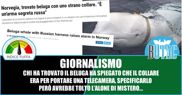Tante testate ieri hanno riportato la notizia del beluga ritrovato con una imbracatura indosso nei mari di Norvegia, Quotidiano .net ha titolato così:
