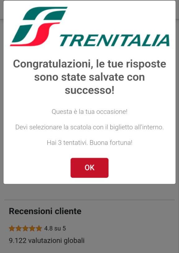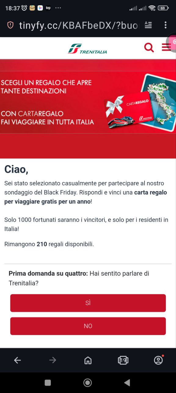 Come sempre ho seguito tutti i passaggi dell’offerta, per poterla documentare per voi. Cliccando sul link, che a quasi tutti arriva da amici su WhatsApp (sarebbe bello sapere da chi l’ha ricevuta il primo che l’ha ricevuta, perché è lì che si cela il truffatore), si finisce su una falsa home page di Trenitalia: