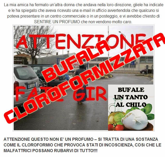 Stavolta hanno evitato di scadere nel razzismo omettendo la provenienza delle due truffatrici…ma la sostanza è la stessa. Giusto per dirla tutta, ma voi per sentire un profumo ve lo spruzzate su naso/bocca? A me hanno insegnato che si spruzza sul polso e lo si annusa da li…ma a parte questa considerazione…vi pare possibile che in posti affollati come i parcheggi dei centri commerciali ci siano due che vanno in giro ad addormentare la gente senza che nessuno se ne accorga? Vi pare sensato? A quel punto tanto vale che vi diano una botta in testa, tanto il risultato è lo stesso!