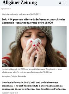Ci avete segnalato alcuni post di soggetti che non credono alla notizia che la normale influenza quest’anno non si sia fatta viva. O meglio, soggetti convinti che non siano corrispondenti alla realtà titoli come quello che viene fatto girare dell’Allgäuer Zeitung, testata tedesca che qualche giorno fa scriveva: