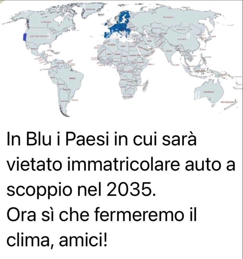 La scritta è sotto una mappa del mondo in cui in blu sono stati evidenziati i paesi dell’UE e la California. L’immagine, se dovessimo analizzarla come un comune utente che non ha tempo, voglia o strumenti per approfondire, sembra corretta: quelli sono i Paesi in cui i giornalisti (e i politici) italiani ci hanno detto che si smetterà di vendere veicoli endotermici.