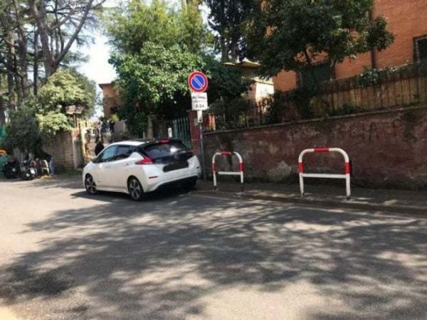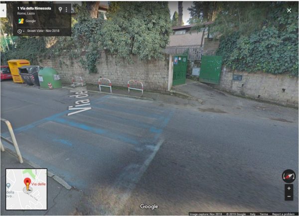 Qui sotto possiamo vedere come, a novembre 2018, sul cancello che, secondo il Messaggero, oggi presenta un divieto di sosta/passo carrabile, non vi fosse alcun segnale di passo carrabile. Purtroppo la mancanza del cartello di Passo Carrabile su Google Maps mi obbliga a fidarmi de Il Messaggero, tra il 2012 e il 2018 non c’è mai stato un cartello passo carrabile su quel cancello, ma nella foto de Il Messaggero qualcosa si vede. Come si evince dalla foto comunque la macchina parcheggiata ostruisce il marciapiede obbligando chiunque passi con carrozzina o passeggino a fare giro largo passando sulla carreggiata riservata alle auto. E questo, specie in prossimità di una scuola è pessimo.