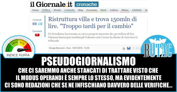 Sono anni che cerco di raccontare come certe redazioni pubblichino la qualunque senza alcuna verifica. La Gazzetta del Mezzogiorno stavolta ci è stata attenta e dopo forse qualche errore iniziale ha pubblicato un articolo corretto. Perché la redazione del Giornale no? Ovviamente il concetto è sempre lo stesso: su certe notizie le verifiche dei fatti non contano, conta solo che facciano totalizzare visualizzazioni. E un titolo che racconta di un tesoro milionario ritrovato per caso fa sempre gola a un certo pubblico.
