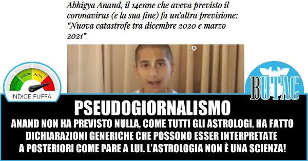 Siate buoni, mi spiegate quale università riconosciuta come tale dà lauree in “microbiologia ayurvedica” e cosa siano? Ve lo chiedo per favore, giusto per sapere da quali atenei tenere lontano i miei figli. Comunque, Abhigya ci viene presentato come un piccolo genio, che avrebbe indovinato previsioni su come sarebbe andato il futuro in tante precedenti occasioni. Ed è così stimato che un quotidiano italiano ritiene interessante riportare anche l’ultima sua previsione, quella che parla di una catastrofe distruttiva che interesserà la Terra fino a marzo 2021. Chissà, magari arriva l’asteroide e colpisce in un solo colpo la redazione del FQ e casa del giovane astrologo.