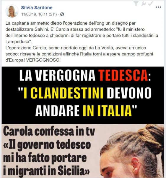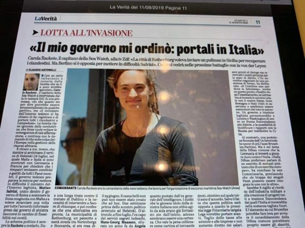 La capitana ammette: dietro l’operazione dell’ong un disegno per destabilizzare Salvini. E’ Carola stessa ad ammetterlo: “fu il ministero dell’Interno tedesco a chiedermi di far registrare e portare tutti i clandestini a Lampedusa”. L’operazione Carola, come riportato oggi da La Verità, aveva un unico scopo: ricreare le condizioni affinché l’Italia torni a essere campo profughi d’Europa! VERGOGNOSO!