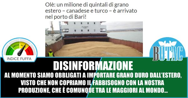 Qui su BUTAC sappiamo benissimo a cosa fanno riferimento, sono anni che Grano Salus allarma sul grano che arriva da altri Paesi, in particolar modo dal Canada. Una battaglia che li ha visti finora sempre affiancati da Coldiretti e dai tanti blog della galassia dell’estremismo di destra (curiosa come cosa, non trovate anche voi?). Ad oggi tutti i blocchi navali e successivi controlli fatti non hanno portato a evidenziare irregolarità particolari. I carichi hanno passato i controlli sanitari e sono stati regolarmente introdotti nel nostro Paese. Grano Salus vuole spaventare, vuole convincere il governo a introdurre misure restrittive per queste importazioni, preferendone evidentemente altre. Sì, perché vedete, il problema è che pur essendo l’Italia uno dei maggiori produttori di pasta al mondo – e anche il maggior coltivatore europeo di grano duro -, non ne produciamo abbastanza per quanto ne usiamo. Siamo costretti a importarne. Come riportava ANSA a giugno 2018: