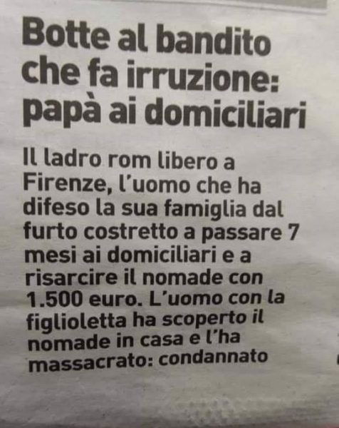 Botte al bandito che fa irruzione: papà ai domiciliari – Il ladro rom libero a Firenze, l’uomo che ha difeso la sua famiglia dal furto cotretto a passare 7 mesi ai domiciliari e a risarcire il nomade con 1500 euro. L’uomo con la figlioletta ha scoperto il nomade in casa e l’ha massacrato: condannato
