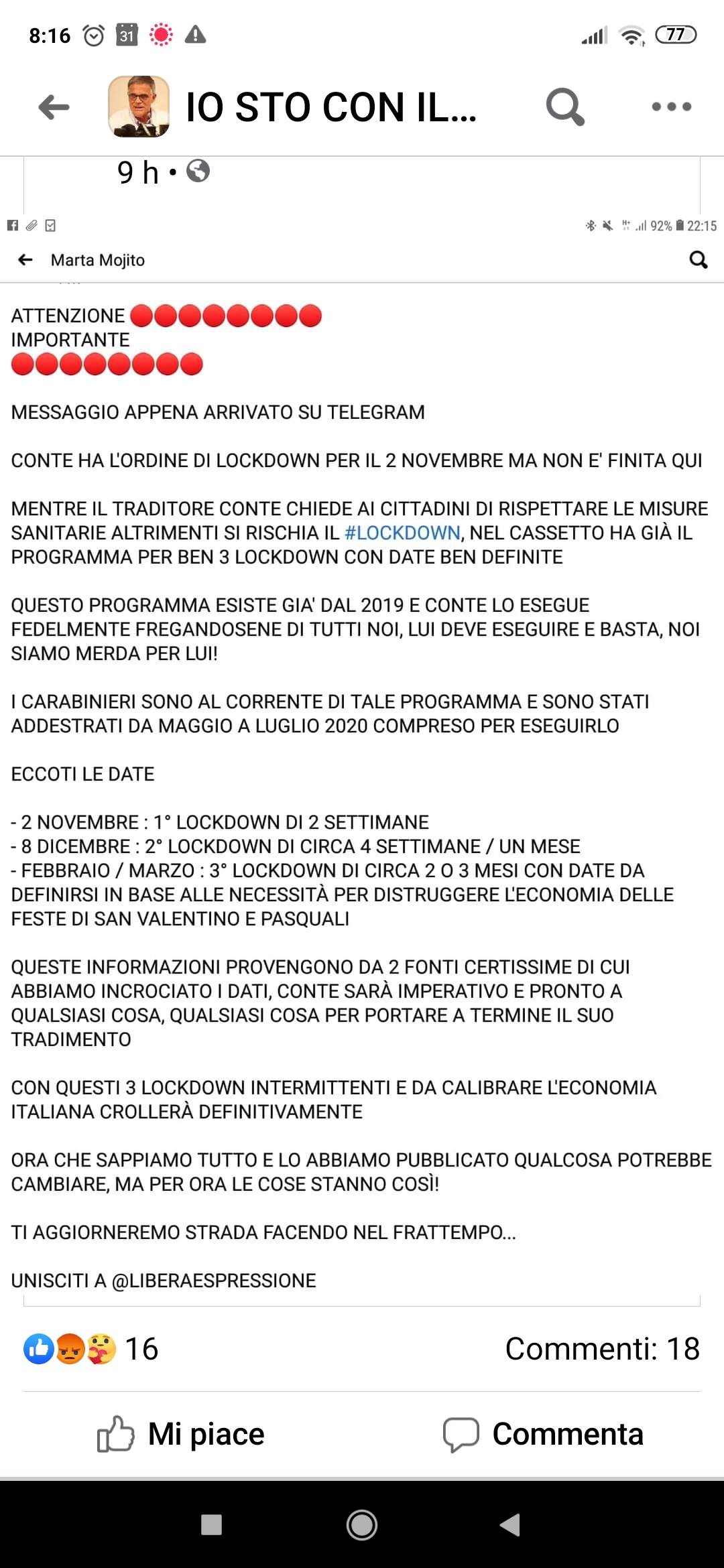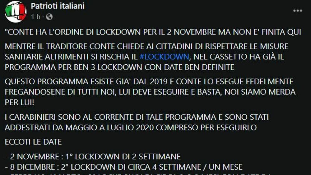Probabile che il nostro Paese stia andando verso un lockdown, quando non si sa, con che regole neppure. Ma il messaggio che sta circolando su Telegram e Whatsapp è una bufala messa in giro da gruppi legati all’estremismo di destra e a Q. Perché l’ordine è abbastanza chiaro: far sì che la gente sia nella confusione più totale e non capisca cosa è vero e cosa no.