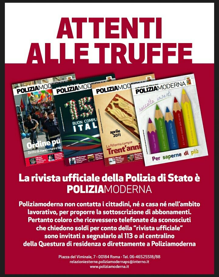 Il giochino è semplicissimo: una telefonata in cui viene offerto un abbonamento a una rivista dedicata a uno dei tanti corpi di polizia italiani, o appunto un “manuale sulla sicurezza”, o magari un calendario delle forze dell’ordine… una volta mi fu persino offerto di comperare un adesivo di “amico della polizia” cercando di convincermi che con quello sulla vetrina i ladri ci avrebbero pensato due volte prima di tentare la rapina. Le telefonate danno sempre a intendere che si stia parlando con un rappresentante dell’Autorità, e che negare l’acquisto ci metta in cattiva luce di fronte alle forze dell’ordine, causando magari problemi alla nostra attività. Una volta che diciamo sè è come quando autorizziamo un contratto telefonico. Oltretutto spesso quando l’utente a posteriori si rende conto di esser stato truffato se ne vergogna e difficilmente denuncia. Anche perché la cifra carpita di solito è nell’ordine di qualche centinaio di euro.