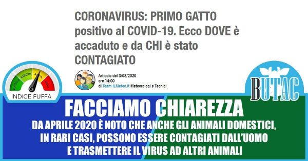 La prima cosa da dire è che quel “primo gatto contagiato” è una bugia, una bufala bella grossa. Già ad aprile 2020 l’OMS aveva eliminato dalle sue linee guida la pagina dedicata agli animali domestici, spiegando chiaramente che non erano immuni – anche se il contagio era raro – e che non fosse provato se gli animali fossero in grado d’infettare l’uomo. Ne avevamo parlato in un nostro articolo del 9 aprile. Ma i redattori de Il Meteo a quanto pare non leggono BUTAC.
